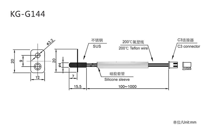 Standard NTC (Customizable):R25℃=100KΩ±1% B25/50=3950K±1%